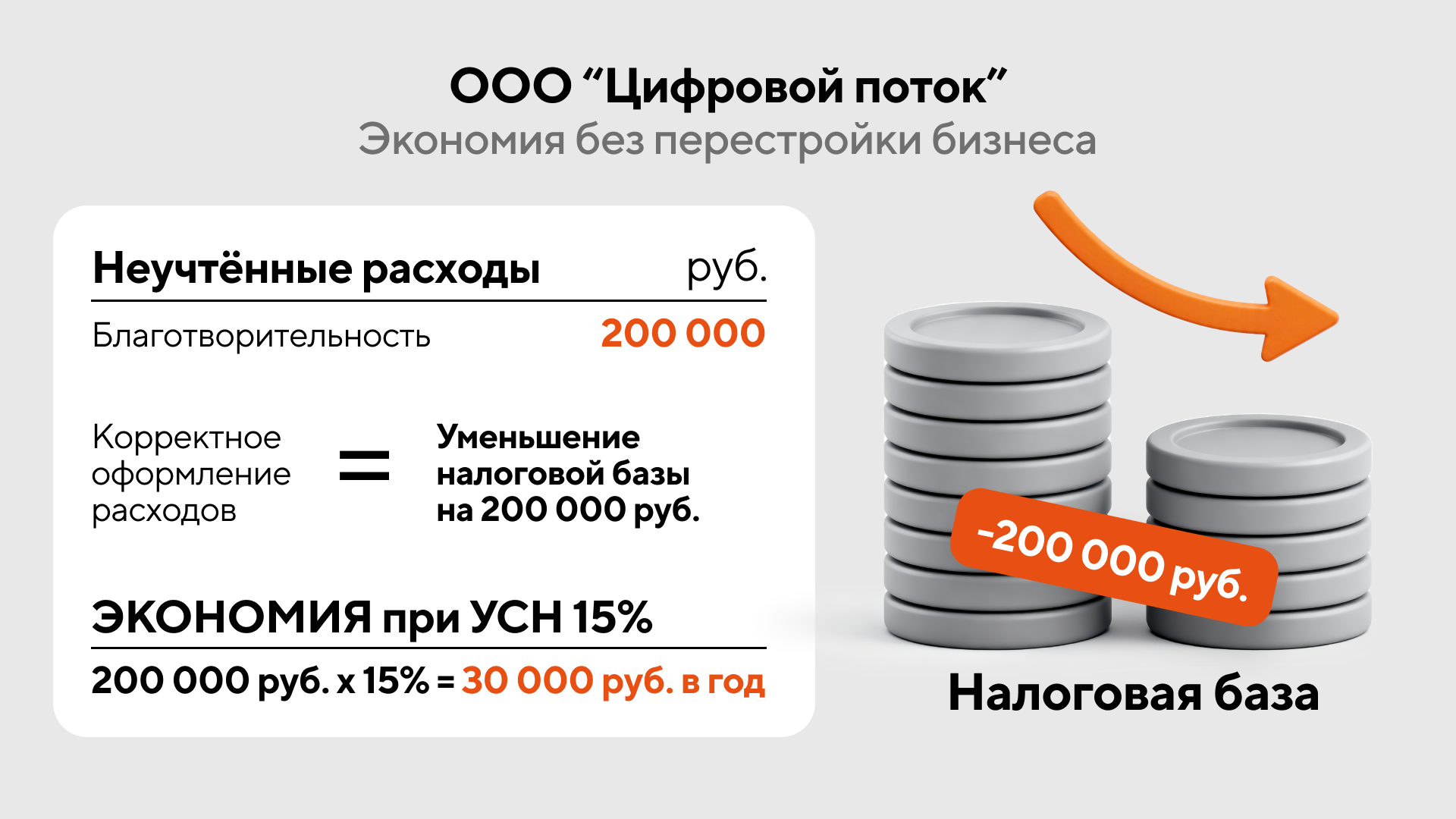 У компании есть 200 000 ₽ благотворительности, проведенной без оформления. После корректного документирования, налоговая база уменьшается на 200 000 ₽, а при УСН 15% это дает дополнительную экономию 30 000 ₽ в год.