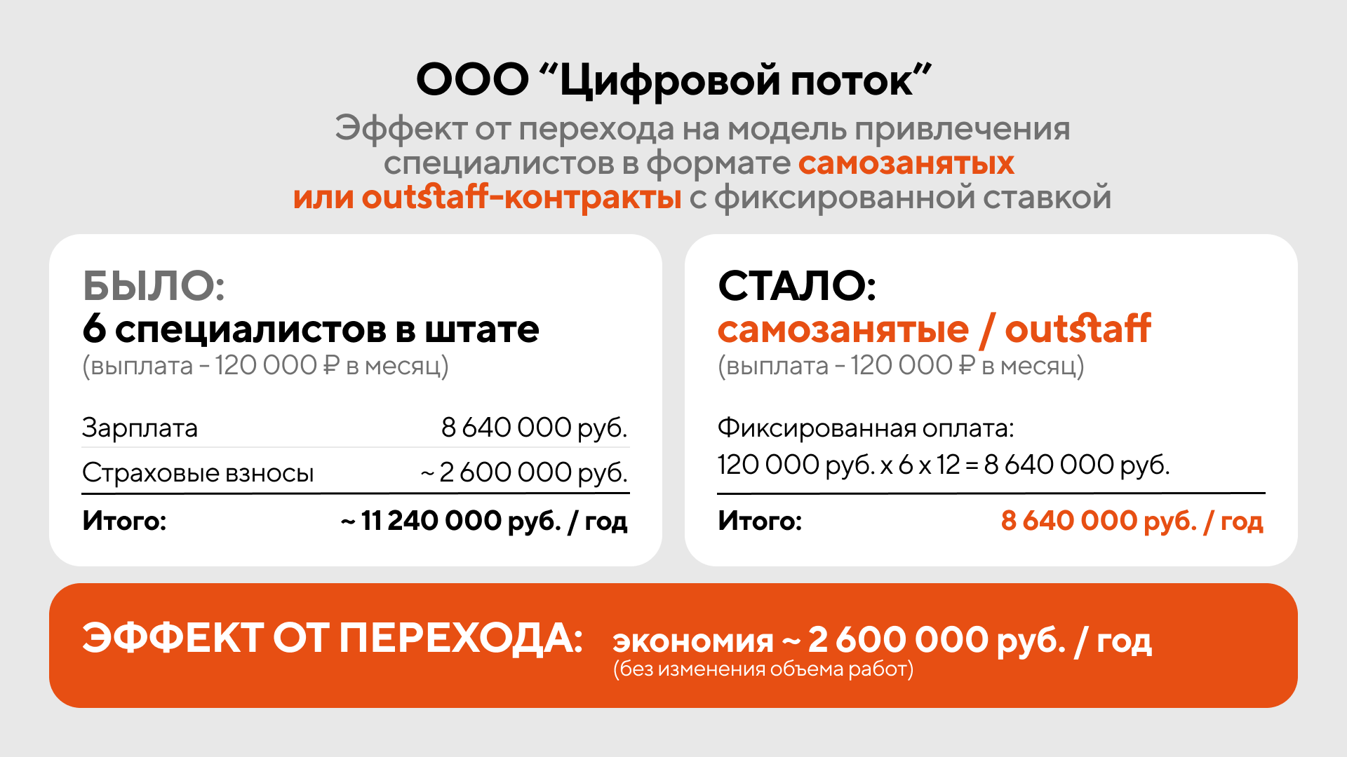 В реальных кейсах переход к проектной и внештатной модели дает бизнесу не только снижение взносов, но и операционный эффект: сокращение рутины, ускорение найма, снижение ошибок и прозрачный ROI по задачам. Именно поэтому перевод части команды в outstaff или самозанятость — это управленческое решение, а не налоговая хитрость.
