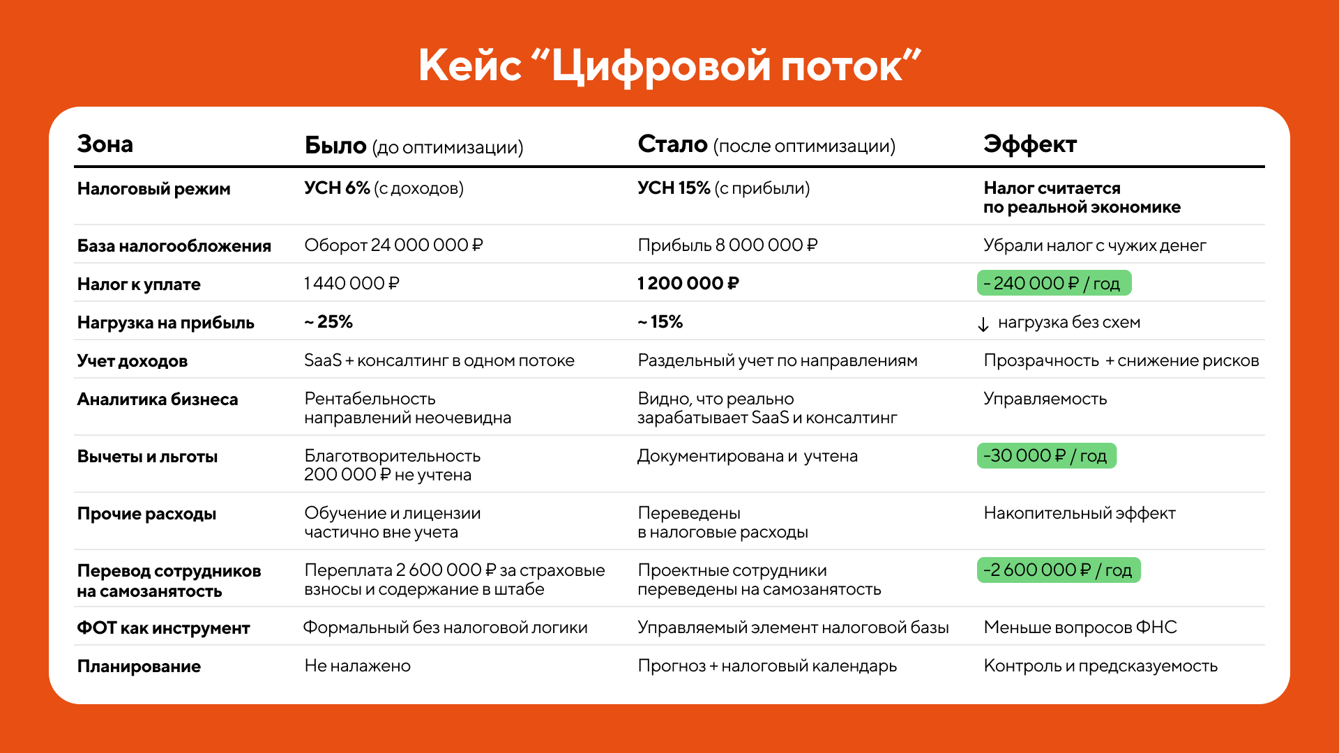 То есть компания отдает государству почти пятую часть своей реальной прибыли, хотя формально платит низкие 6%. Именно с этого момента «Цифровой поток» становится идеальным кандидатом для системной оптимизации.