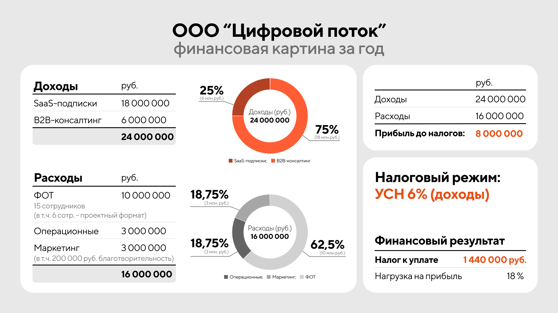 При этом режим УСН 6% («доходы»). Формально все корректно. Налог считается просто: 24 млн x 6% = 1,44 млн ₽ в год.